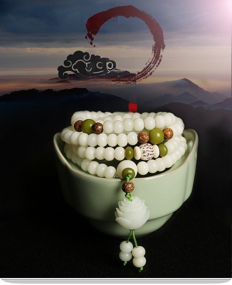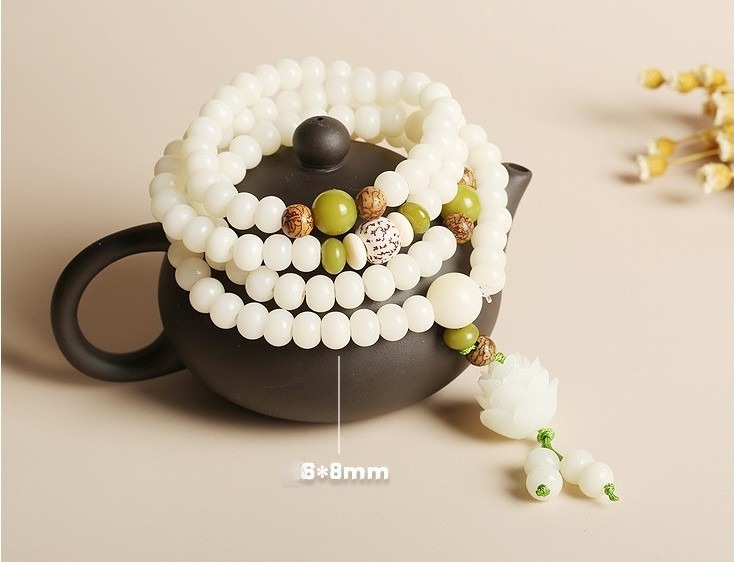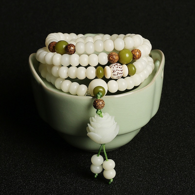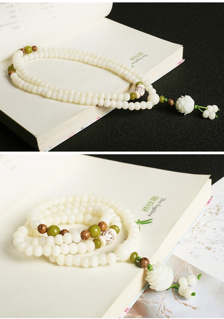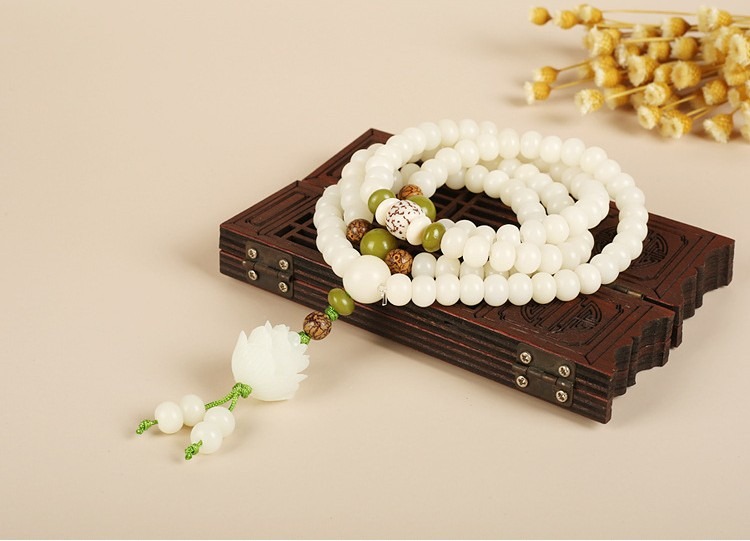 Elevate your spiritual journey with our handcrafted White Jade Bodhi Lotus Mala, a stunning, one-of-a-kind piece made with meticulous artisanal care. Strung on durable elastic cord, this versatile mala works beautifully as a multi-wrap wrist bracelet or a statement spiritual necklace, blending sacred tradition with timeless, serene elegance.